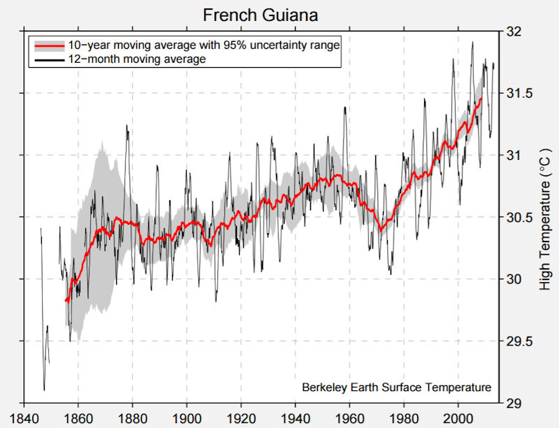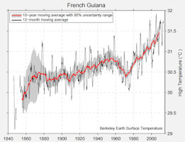 French Guiana will not escape the consequences of global warming. The same trends will be observed here as those around the world, such as the 1.2°C rise in temperature recorded at the Rochambeau station since 1950. Climate change will have several major effects. A rise in sea levels of between 10cm and 90cm would result in the coastal strip receding and the mangrove forest migrating inland, as well as more frequent floods. The more severe effects of the El Niño phenomenon would lead to longer droughts, as well as more violent rain on occasions. The Amazonian forest could give way to savannah, meaning a loss in biodiversity and large amounts of CO2 being released (by forest fires).