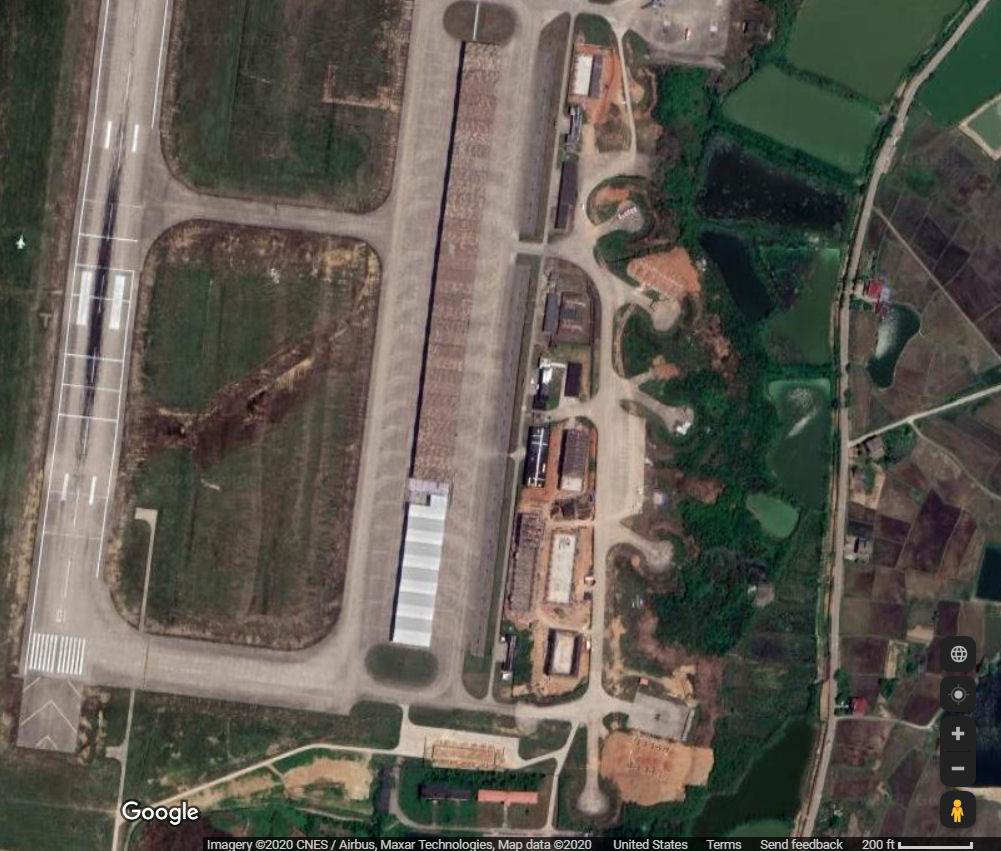 This airfield, which is located well to the south of the city of Nanchang, is clearly a military airbase, while other civil operations are probably conducted from the primary dual-use Nanchang airfield. Over time, the robust complex of revetted parking spaces for fighter aircraft have become less prominent in imagery, and the complex at the south end of the field appears disused. Such revetted parking areas were required to provide protection during attack. Instead, a total of 24 hangars have been constructed in a single row at the south end of the field.
