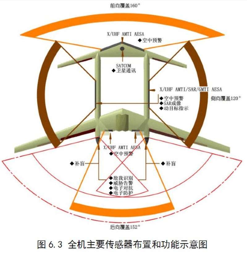 It may be equipped with seven radars, including an X / UHF AMTI electronic scanning phased array radar (AESA) at the front end and two X / UHF AMTI / SAR / GMTI AESA radars at two domes. There are two X / UHF AMTI AESA radars on both sides of the engine nozzle, and two radars at the end of the dome. The horizontal width of the Divine Eagle UAV radome is about 1.5 meters. The Divine Eagle interferometer radomes have a diameter of 5 or 7.5 meters.