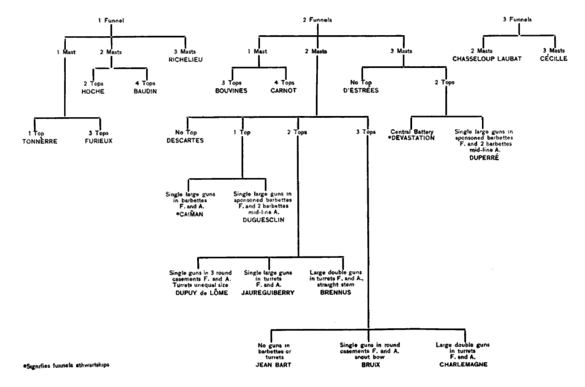 From a list of forty-four French ships of 1898, it was possible to arrange the ships, first, according to the number of their funnels, including those which have them disposed athwartships. In this way there are three columns, which can be subdivided according to the number of masts, and further subdivision can be introduced according to the number of fighting tops on the foremast. If the vessel is approaching end on, the tops on the mainmast would possibly be obscured by the funnels. Under fighting- top subdivisions there would be remaining no group containing more than three ships.