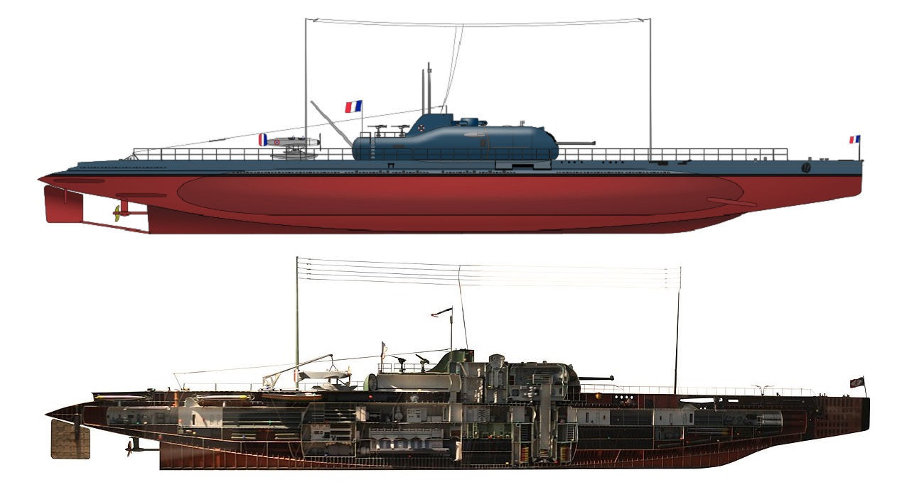 The Surcouf was designed in France in 1926, taking full advantage of the German experience in constructing large U-Boats heavily armed with artillery. In terms of size, it was much larger than the huge British M and X submarines built a bit earlier. Its technical parameters, range and armament fully justified classifying it as a submarine cruiser. All the more so as the gun's displacement and caliber corresponded to surface cruisers of that time, and additionally had light armor. Two more identical units were originally planned, but were soon abandoned. Surcouf was built in the Cherbourg arsenal. Its construction, from placing an order in December 1927, took three years. The launching ceremony took place on October 18, 1929, while the flag of the French Navy was hoisted in May 1934.