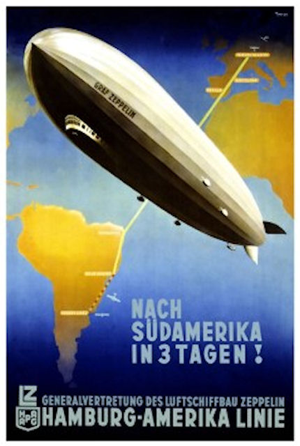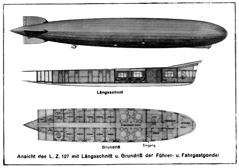 The keel was laid for the Graf Zeppelin [ie, Count Zeppelin] in 1926. Called the "most beautiful airship of them all", she was 775 feet long, 100 feet in diameter, developed a speed of 70mph, had five 530hp Maybach engines, and had a 6,250 mile unrefuelled range. She carried a crew of 44, with accommodations for 20 passengers, and had a dining room and saloon. The Hindenburg, launched seven years later (March, 1936) had four 1050hp Daimler-Diesel engines, a top speed of 81mph, a similar range to the Graf Zeppelin, and carried 100 people.