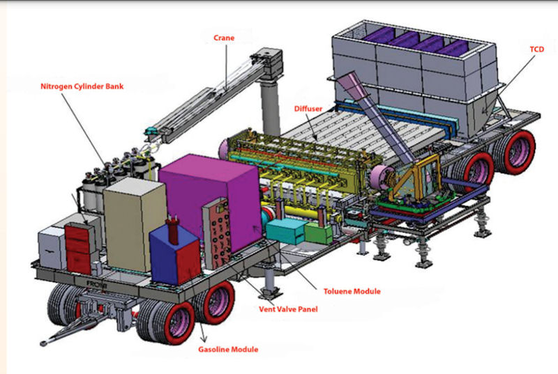 Laser Generation Vehicle (LGV) has been developed to generate a high energy beam. The input energy is pumped into the system through combustion of large amount of air and toluene. The system mainly consists of laser tunnel, toluene storage, gasoline storage and pressurisation and feed system, parts of combustion, ignition, aerodynamic window, cavity bleed, fuel purging, pneumatic air supply lines, control panel, etc. The laser tunnel consists of a combustor, a nozzle bank with cavity, resonator, diffuser and TCD. These systems are mounted on a low bedded transportable trailer having suitable canopy. The LGV is dependent on ASV for oxidiser air supply and command control vehicle for operation commands for generation of high energy beam.