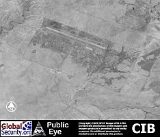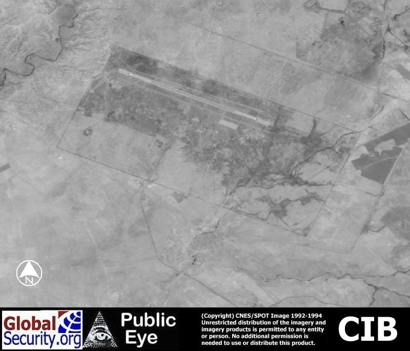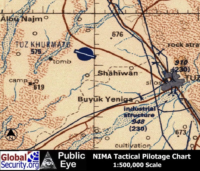 Tuz Khurmatu Airbase is located approximately 180 kilometers North of Baghdad, and about 14 kilometers West of the town of Tuz Khurmatu. The airbase is served by a 9,800 foot long runway. There were at least 8 hardened aircraft shelters visiable in the 1995 CIB imagery.