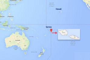 Samoa is located south of the equator, about halfway between Hawaii and New Zealand in the Polynesian region of the Pacific Ocean. The total land area is 1,097 square miles, consisting of the two large islands of Upolu and Savai'i, which account for 99 percent of the total land area and eight small islets. About 80 percent of all land is customary land, owned by villages, with the remainder either freehold or government owned. Customary land can be leased.