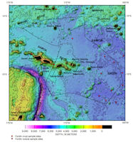 The newest volcanic eruption in American Samoa island chain is forming about thirty miles east of Ta’u Island, but it will probably be another few hundred years before this sub-surface volcano, named Vailulu’u, breaks the sea surface (in 2005 it was 1800 feet below the surface and growing).