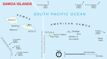 Western Samoa comprises the westernmost islands of the Samoan archipelago, located in the heart of Polynesia. Its nearest neighbors are other island nations: Tokelau to the northeast, the Cook Islands to the east, Tonga to the south, and Fiji to the southwest. New Zealand lies 2,900 km to the south and northern Australia 4,700 km to the west. Samoa is located about halfway between Hawaii and New Zealand in the Polynesian region of the South Pacific.