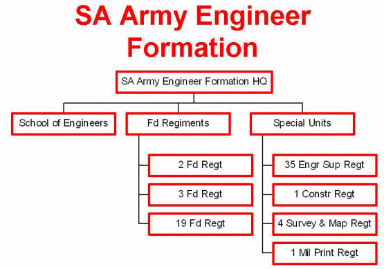 In 1982, the SA Army Engineer Formation was created with the Directorate of Engineers as its Headquarters and commanded by the Director of Engineers which gave the Directorate operational control over most of its Engineer Units. During this time, control of the School of Engineers passed to the Director of Training, so did all Corps Schools. In 1983, ministerial authority was obtained for the conversion of all Field Squadrons, normally attached to the conventional forces, to Field Engineer Regiments, each comprising a headquarters, 2 field squadrons and a support squadron. Each squadron has 3 troops. This did not affect Engineer Squadrons attached to the territorial commands for counter-insurgency operations.