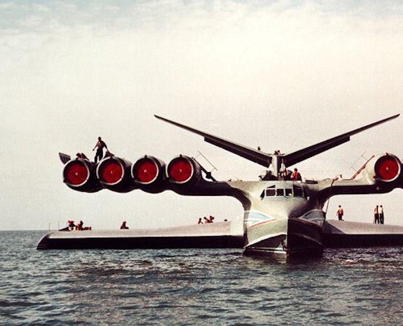 In 1966 the Central Hydrofoil Design Bureau under Rostislav Alekseev produced a gargantuan "ekranoplan" ("surface plane") combining the smooth hull form of a ship with stub wings, a large vertical fin and horizontal tail. The craft featured ten engines: eight mounted in two clusters of four directly behind the cockpit to provide augmented lift, and two on the vertical fin to provide cruise power. This machine, which American intelligence organizations dubbed the Caspian Sea Monster, could lift 540 tons and cruise at over 300 mph at an altitude of over 10 feet.