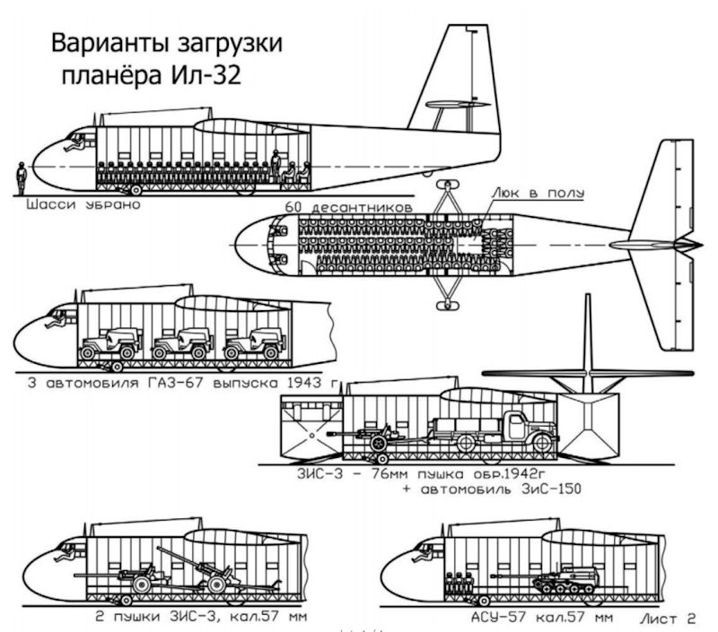 The IL-32 airborne cargo glider was designed by S.V. Ilyushin Design Bureau and built in 1948 on instructions from the Air Force. The IL-32 glider in terms of carrying capacity and cargo compartment size was significantly larger than the gliders created before in our country, and was intended for the transportation of various equipment and bulky goods with a total mass of up to 7000 kg or a landing force of up to 60 people. The glider with a flight weight of 16,600 kg was designed for towing aircraft of the Il-18 type (built in 1946) or Tu-4 .