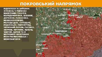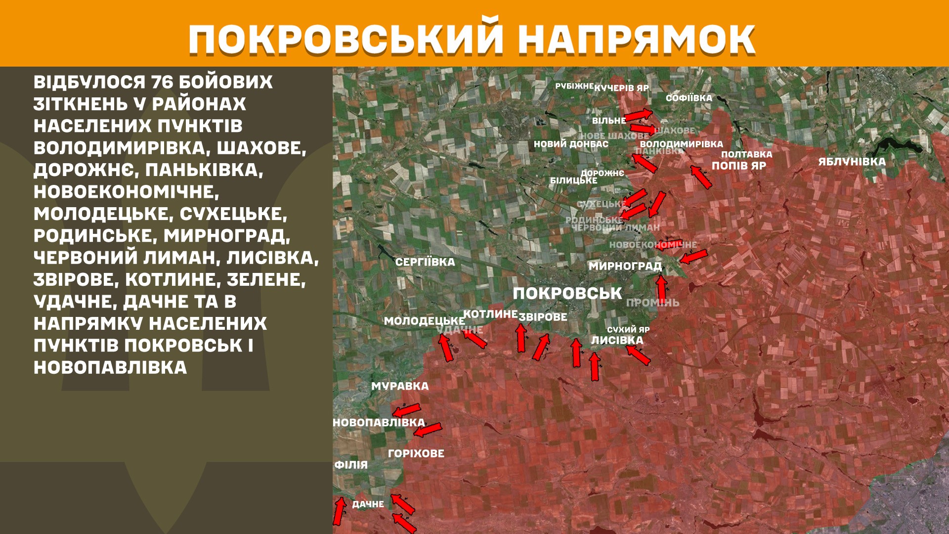 Throughout the day in the pokrovsky direction, the Russian enemy committed 53 offensive actions. The activity of Russian occupiers was fixed near the settlements of Nikanorivka, Mayak, Suhetske, Rodinske, Red Leiman, Novoekonomíčne, Mykolaivka, Ray, Fox, Pokrovsk, Zvirove, Kotline, Udaachne, Molodetske, Novomikolaivka, Kotlyarivka, Gorihove and Dachne. Four fighting clashes are going on so far.