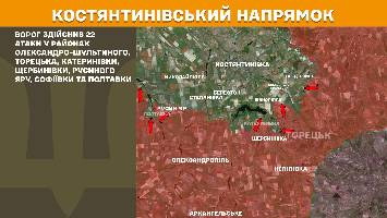 In the Konstantinivsky direction, Russian occupiers today 24 times stormed the positions of Ukrainian defenders in the areas of the settlements of Bila Gora, Oleksandro-Shultyne, Scherbinivka, Pleschievki, Rusin Yar. Defense forces are steadily suppressing the pressure and repelled 22 Russian attacks, currently fighting is being sharpened in two locations.