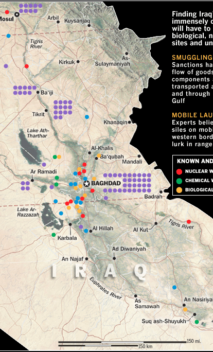 Sources: NASA, UNMOVIC, IAEA, Globalsecurity.org, Federation of American Scientists, Monterey Institute of International Studies, Iraq Watch