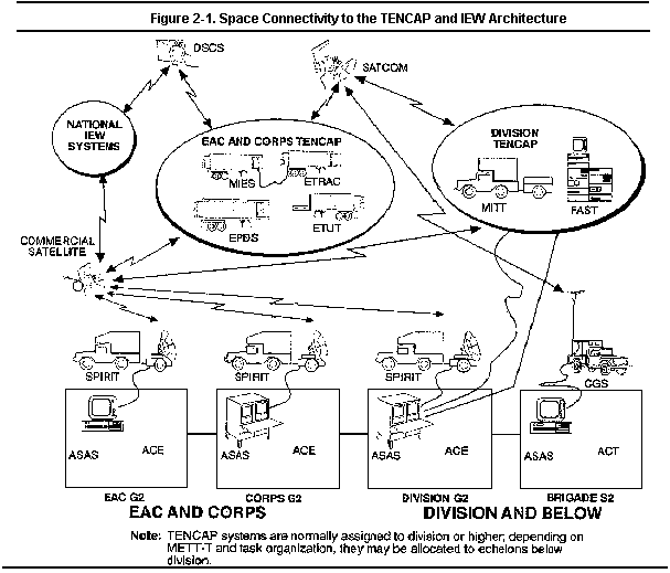 The diverse and multifunctional array of space systems offers unique advantages that increase the Army's versatility and can have a dramatic effect on all Army missions. Satellites are in orbit, have worldwide coverage, and can support training, MOOTW, and combat equally well. The POS/NAV satellites--NAVSTAR GPS--enable anyone with a passive receiver to know his position more accurately. Military and civilian communications satellites offer worldwide links with virtual line of sight to anyone. Weather and terrain information is available from Defense Meteorological Satellite Program (DMSP) and civil environmental satellites, such as the US-launched civil earth imaging satellites Landsat), Japanese launched marine observation satellite (MOS-1), and France's Systeme Probatoire d'Observation de la Terre (SPOT) satellite, to support intelligence preparation of the battlefield (IPB), planning, and rapid decision making. Space systems provide reconnaissance, intelligence, surveillance, and target acquisition (RISTA) and communications support to tactical commanders. The Army's TENCAP Program provides the interface between space-based intelligence and electronic warfare (IEW) sensors and the all-source analysis system (ASAS) within the analysis and control element (ACE) located at echelons above corps (EAC), corps, divisions, separate brigades, and armored cavalry regiments (see Figure 2-1).