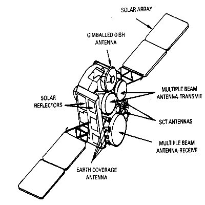 - DSCS III: The DSCS III program is a vital part of the comprehensive plan meeting national military communications needs. A six-channel communications transponder with each channel operating through its own RF amplifier serves the users. This allows compatible grouping of users for efficient use of the SHF frequency spectrum of 7.9 to 8.4 GHz. The DSCS III satellite carries two communications payload packages. The primary payload is at SHF, satisfying the space link requirements of standard military communications networks. The secondary payload is an US Air Force SATCOM UHF single transponder used to transmit emergency action messages between military command posts (CPs) and force elements. The communications system is supported by one receive multibeam antenna (MBA), two receive ECH antennas, two transmit MBA's, two transmit ECH antennas, and a gimballed dish antenna (GDA). Each of the six independent repeaters operates in the SHF region to relay telephone, data, wideband imagery, and secure digital voice signals using FM, BPSK, quadrature phase shift keying (QPSK), staggered quadrature phase shift keying (SQPSK) and frequency hopping pseudo noise (PN) spread spectrum modulation. Each terminal has access to any channel and each channel can relay, with minimum performance degradation, signal transmissions consisting of FDMA, TDMA, and spread spectrum multiple access (SSMA) via the PN carrier modulation technique. Linear, quasilinear, and saturated modes of operation are provided by means of selectable gain steps. The MBA with the beam forming the network can shape antenna patterns to arbitrary selected coverage areas.