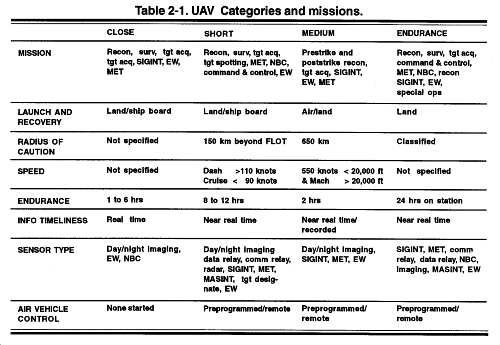 The US military has classified four types of UAVs: close range, short range, medium range, and endurance. Categories and missions for these UAV types are identified in Table 2-1.