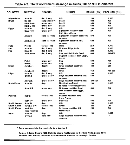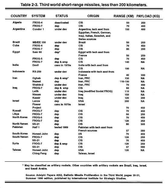 Many countries already possess the capability to manufacture their own rocket systems. These countries then deploy or export them to other countries. Presently, countries that have deployed ballistic missiles are Libya, North Yemen, Syria, Iraq, Israel, Egypt, Iran, Kuwait, South Yemen, Taiwan, Cuba, North Korea, Pakistan, Algeria, and South Korea. A correlation exists between the acquisition of missiles and the acquisition of nuclear, biological, and chemical (NBC) programs. Three countries are believed to have nuclear weapons in stock or ready for easy assembly. They are India, Israel, and Pakistan. Argentina, Brazil, South Africa, and Iraq have significant nuclear programs. Countries believed to have stockpiles of chemical weapons are Egypt, Iran, Iraq, Israel, Libya, North Korea, South Korea, South Africa, Syria, and Taiwan. The four countries alleged to have stockpiles of biological weapons are Iran, Iraq, North Korea, and Syria. The next two tables outline the ROW countries that most likely have ballistic missiles.