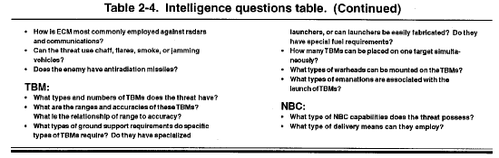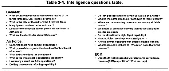 To effectively counter the regional threat, a thorough evaluation of the threat's capabilities, strengths, and weaknesses must be conducted. The Patriot battalion commander should ensure that intelligence information on regions and countries that may become areas of conflict for the battalion is continuously gathered, evaluated, and disseminated. The battalion's intelligence officer should keep abreast of this information and, immediately following alert notification, be able to address the questions in Table 2-4.