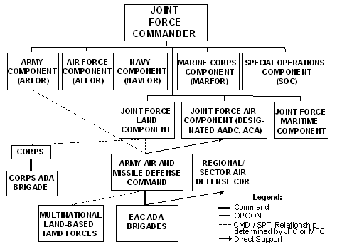 2-11. This section is based on Joint Publication 3-01, Joint Doctrine for Countering Air and Missile Threats. It illustrates that the AAMDC not only will have a command relationship with the Army forces commander, but also will have a support relationship with the AADC and may even have a command relationship with the AADC and JFLCC. Theater command and control relationships are shown in Figure 2-2. |