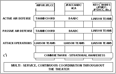 The focus of this chapter is the AAMDC's command and support relationships with all components and subordinate units. The roles of the commanding general of the AAMDC as senior Army ADA commander, theater Army air and missile defense coordinator (TAAMDCOORD), and deputy area air defense commander (DAADC) reflect the theater command and control structure. Coordination and liaison are essential to effective air and missile defense.