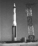 Atlas missile 25-D rises to a vertical position and begins a test flight on 22 April 1960. Atlas Ds--the first Atlas missiles to become operational--were stored in unprotected, above-ground horizontal launchers. Later models of the Atlas were better protected. Atlas Es were stored in semi-hardened horizontal launchers, and Atlas Fs were stored in hardened vertical silos.