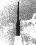 A Peacekeeper Flight Test Missile during launch from Vandenberg AFB in June 1985. Unlike the Minuteman, which was launched by igniting the stage 1 motor while the missile was still in the silo, the Peacekeeper was ejected from its silo by hot gas, and its stage 1 motor was ignited when it was about 100 feet above the ground.