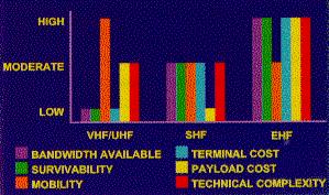 However, each frequency band brings certain advantages to the operational user that are simply not available in the other bands. For example, while the tactical utility of UHF can almost be replicated at EHF (although mobility and adverse weather use both suffer), the cost of such a