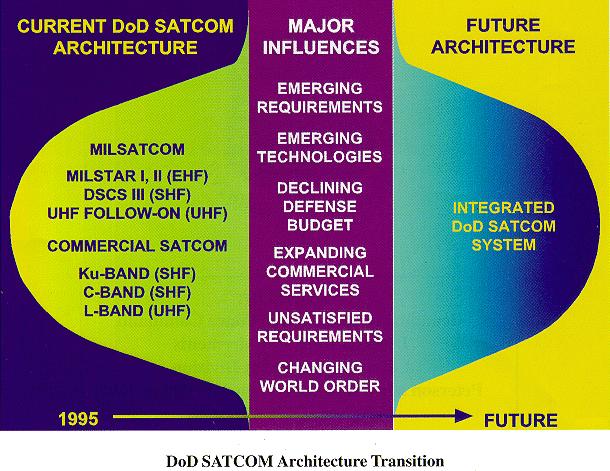 DoD SATCOM requirements are anticipated to increase dramatically in the next decade. The information explosion, CONUS-based force structure, and far-flung operations all will stress DoD's ability to provide uninterrupted connectivity to the warfighter. Other major influences include a changing world order, declining defense budgets, and emerging SATCOM technologies. The aim of the future architecture is to greatly increase both the capacity and capability of SATCOM services while reducing the overall costs compared to the cost of the current architecture. The integrated DoD SATCOM system will include a mix of militarily acquired and commercially acquired, DoD owned systems, as well as commercial leased services managed by DoD for fixed users and to augment DoD owned resources.