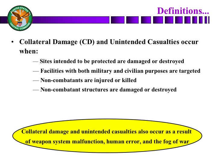 Collateral damage is really kind of two separate pieces. One is damage to facilities and the other is unintended casualties that surround noncombatants. It can occur -- however, it does occur in any conflict, in some cases because of human error, in some cases because of a mechanical error in a weapons system and in some cases, the situation on the battlefield is confused enough that people make mistakes. However, as we evaluate targets potentially to be struck, we do look to ensure that we -- that we stay clear of sites that are intended to be protected, like schools, mosques, civil buildings that have no military value, certainly residence areas. We need to ensure that when we find targets that are what we'll call dual use, and we'll talk a little bit about that later, that we are very prudent in the way we strike those so as to minimize any potential damage or danger to noncombatants.
