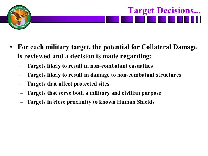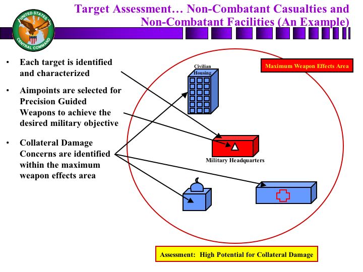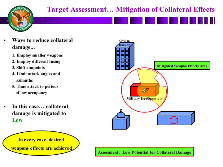In the end, however, occasionally, though, noncombatants are injured and killed, and we do have some structures that are damaged. And our intent is to have a process that not only looks to determine the target's validity, if you will, but then find a means to strike that target to gain the desired military effect without creating an undue effect on noncombatants or surrounding structures.