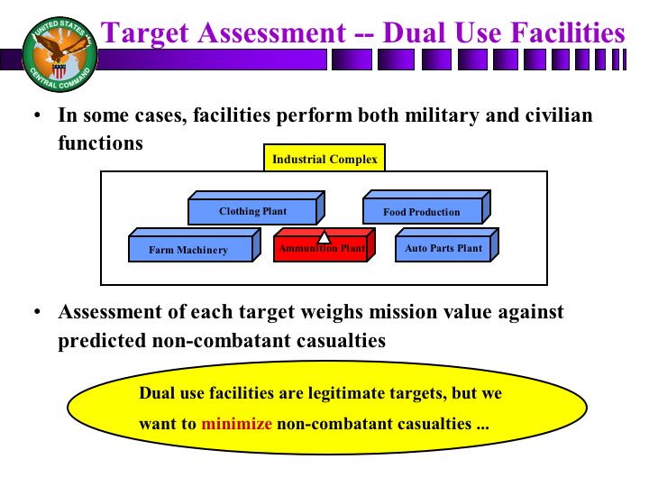 Now, we talked earlier about dual use facilities, and there are situations for sure where facilities are both military and civilian in nature. We take a look at each one of those facilities to determine if the benefit from striking that target outweighs the potential damage to surrounding facilities or to noncombatant casualties. And we -- and while a dual use facility is a legitimate target within the laws of armed conflict, we do want to make sure that we try to strike that target at a point where it minimizes the casualties. And that may be, for example, where I talked about using a day versus a night attack will help you with that.