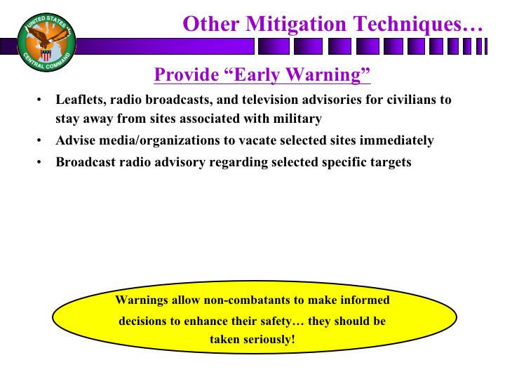 There's one final mean of providing some mitigation, and is essentially provide some warning. We have, as many of you have reported, been using leaflets and radio broadcasts in Afghanistan, and certainly in Iraq now to send messages to the people. In our case, for example, in Iraq, we send messages to have them listen to our radio broadcasts. We send messages to tell them to stay away from military targets. And we would use this same kind of approach to be able to say to the people at a particular target location, "You probably don't want to go around a military base. You might want to stay home. You probably don't want to go to work if you work in one of those dual use facilities. And you can use the media -- I want to rephrase that -- (laughs, laughter) -- the medium of broadcast, both leaflets and the airwaves, to actually say to the civilian community, "You probably ought to stay away from the kinds of facilities that could be targeted in any kind of conflict." And you can do that over time and condition or you can do that in a very short period of time and allow you at least one more means of trying to get that message out to keep people away from a target that may be struck.