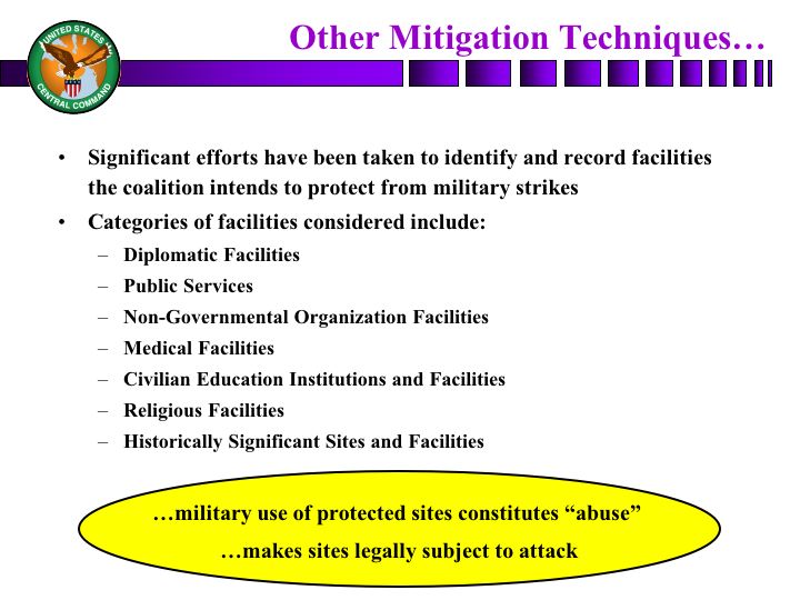 There is an important point, though, and that is once a government, an enemy force chooses to locate military -- valid military targets, like surface-to-air missile systems, like AAA weapons, like tanks, like weapons of mass destruction, if a government chooses to co-locate those with one of these protected sites, they lose their status, under international law, as a protected target. Now, that doesn't mean you're striking the protected target. It means you're striking the military capability that is co-located there. And again, we'll go through a similar process to make sure that you target the thing and not the facility; again, trying to minimize the kind of damage that you might incur.