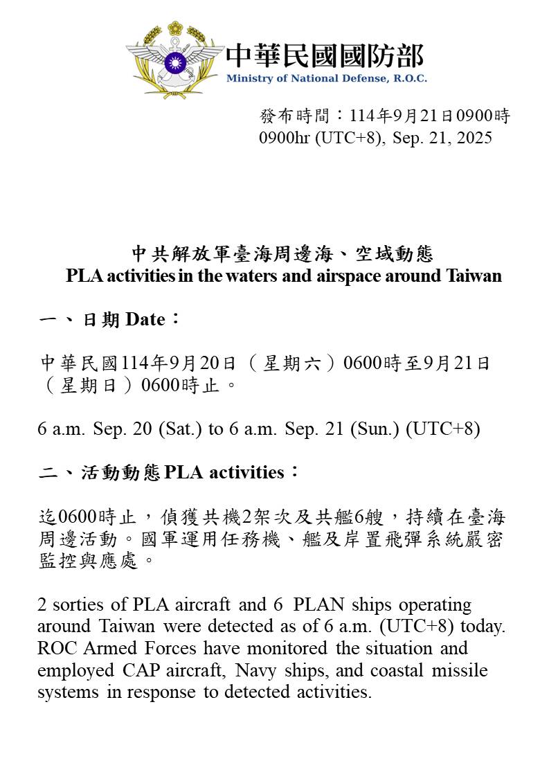 2 sorties of PLA aircraft and 6 PLAN ships operating around Taiwan were detected as of 6 a.m. (UTC+8) today. ROC Armed Forces have monitored the situation and employed CAP aircraft, Navy ships, and coastal missile systems in response to detected activities.