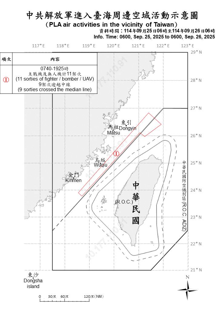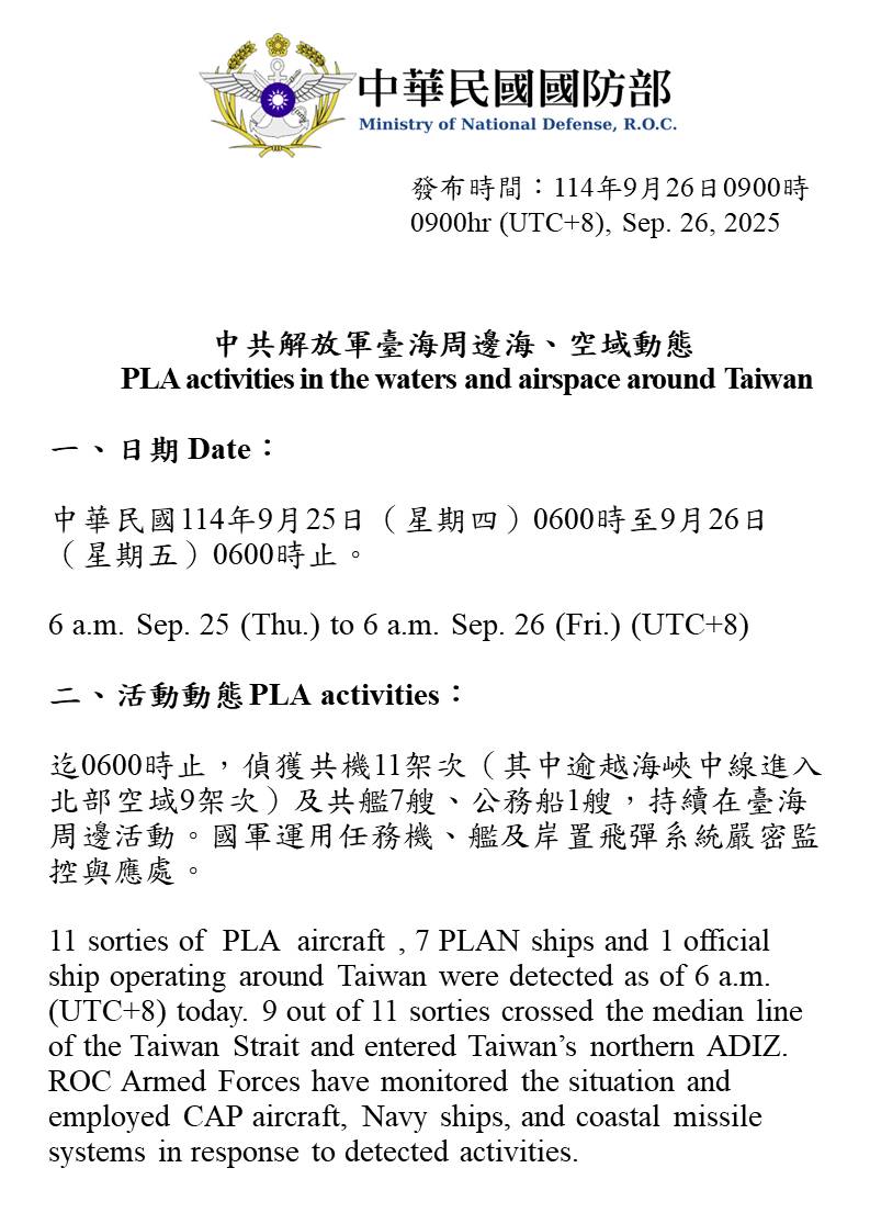 11 sorties of PLA aircraft , 7 PLAN ships and 1 official ship operating around Taiwan were detected as of 6 a.m. (UTC+8) today. 9 out of 11 sorties crossed the median line of the Taiwan Strait and entered Taiwan's northern ADIZ. ROC Armed Forces have monitored the situation and employed CAP aircraft, Navy ships, and coastal missile systems in response to detected activities.