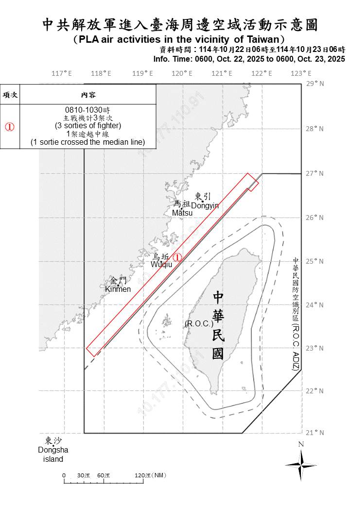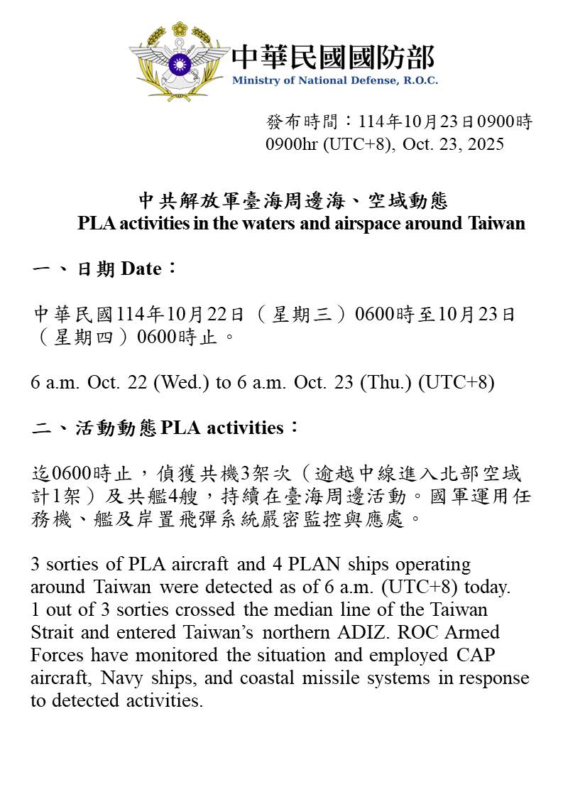 3 sorties of PLA aircraft and 4 PLAN ships operating around Taiwan were detected as of 6 a.m. (UTC+8) today. 1 out of 3 sorties crossed the median line of the Taiwan Strait and entered Taiwan's northern ADIZ. ROC Armed Forces have monitored the situation and employed CAP aircraft, Navy ships, and coastal missile systems in response to detected activities.