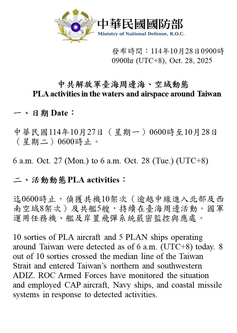 10 sorties of PLA aircraft and 5 PLAN ships operating around Taiwan were detected as of 6 a.m. (UTC+8) today. 8 out of 10 sorties crossed the median line of the Taiwan Strait and entered Taiwan's northern and southwestern ADIZ. ROC Armed Forces have monitored the situation and employed CAP aircraft, Navy ships, and coastal missile systems in response to detected activities.