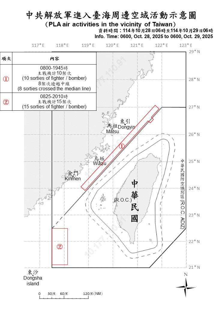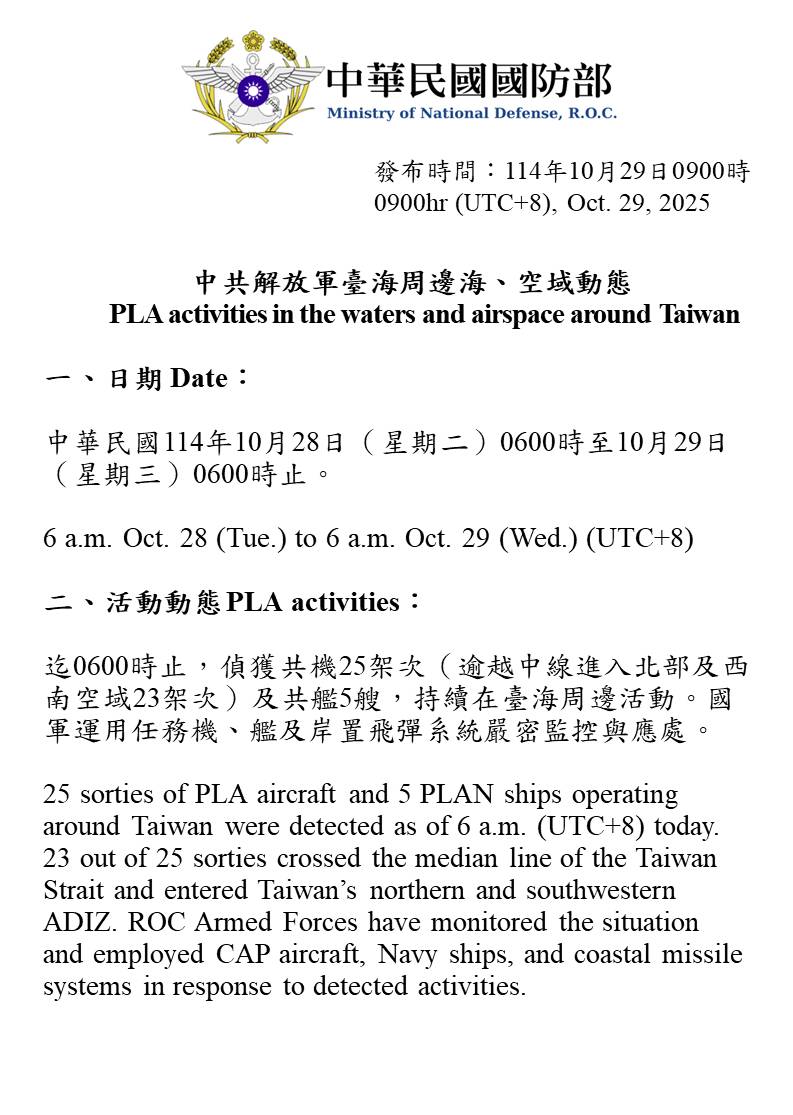 25 sorties of PLA aircraft and 5 PLAN ships operating around Taiwan were detected as of 6 a.m. (UTC+8) today. 23 out of 25 sorties crossed the median line of the Taiwan Strait and entered Taiwan's northern and southwestern ADIZ. ROC Armed Forces have monitored the situation and employed CAP aircraft, Navy ships, and coastal missile systems in response to detected activities.