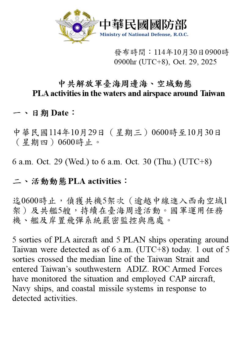 5 sorties of PLA aircraft and 5 PLAN ships operating around Taiwan were detected as of 6 a.m. (UTC+8) today. 1 out of 5 sorties crossed the median line of the Taiwan Strait and entered Taiwan's southwestern ADIZ. ROC Armed Forces have monitored the situation and employed CAP aircraft, Navy ships, and coastal missile systems in response to detected activities.