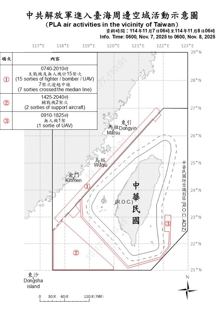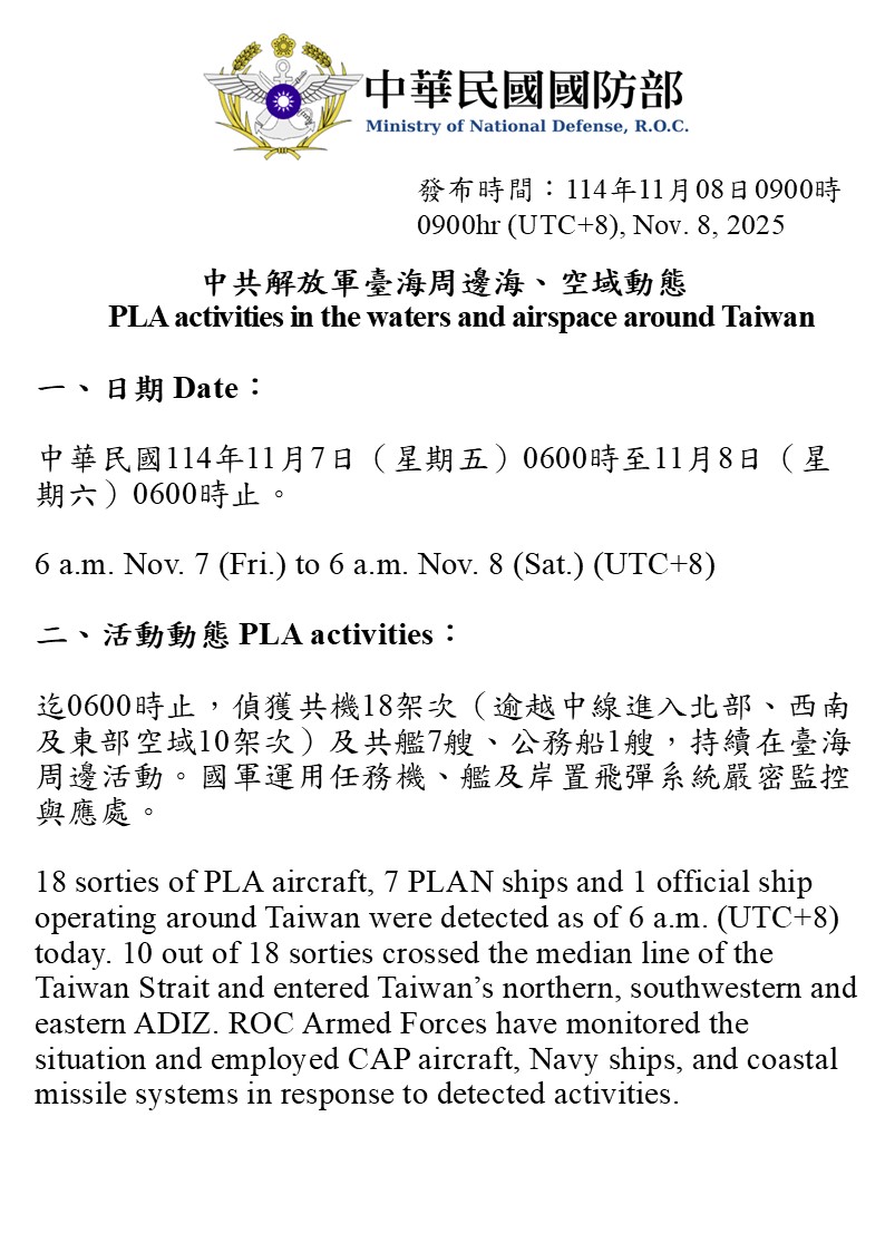 18 sorties of PLA aircraft, 7 PLAN ships and 1 official ship operating around Taiwan were detected as of 6 a.m. (UTC+8) today. 10 out of 18 sorties crossed the median line of the Taiwan Strait and entered Taiwan's northern, southwestern and eastern ADIZ. ROC Armed Forces have monitored the situation and employed CAP aircraft, Navy ships, and coastal missile systems in response to detected activities.