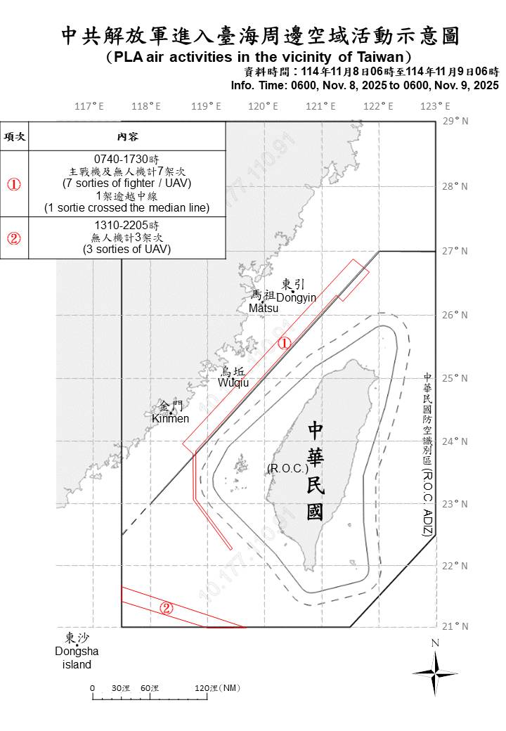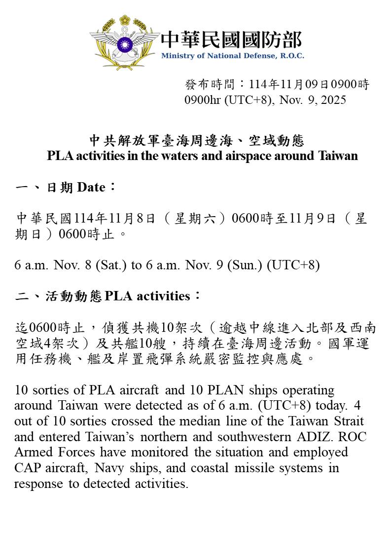 10 sorties of PLA aircraft and 10 PLAN ships operating around Taiwan were detected as of 6 a.m. (UTC+8) today. 4 out of 10 sorties crossed the median line of the Taiwan Strait and entered Taiwan's northern and southwestern ADIZ. ROC Armed Forces have monitored the situation and employed CAP aircraft, Navy ships, and coastal missile systems in response to detected activities.