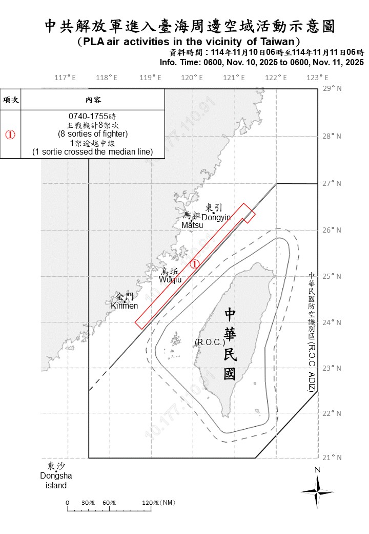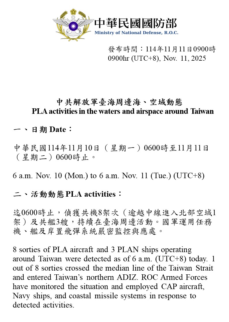 8 sorties of PLA aircraft and 3 PLAN ships operating around Taiwan were detected as of 6 a.m. (UTC+8) today. 1 out of 8 sorties crossed the median line of the Taiwan Strait and entered Taiwan's northern ADIZ. ROC Armed Forces have monitored the situation and employed CAP aircraft, Navy ships, and coastal missile systems in response to detected activities.
