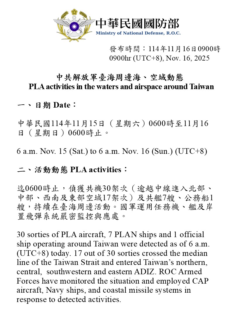 30 sorties of PLA aircraft, 7 PLAN ships and 1 official ship operating around Taiwan were detected as of 6 a.m. (UTC+8) today. 17 out of 30 sorties crossed the median line of the Taiwan Strait and entered Taiwan's northern, central, southwestern and eastern ADIZ. ROC Armed Forces have monitored the situation and employed CAP aircraft, Navy ships, and coastal missile systems in response to detected activities.