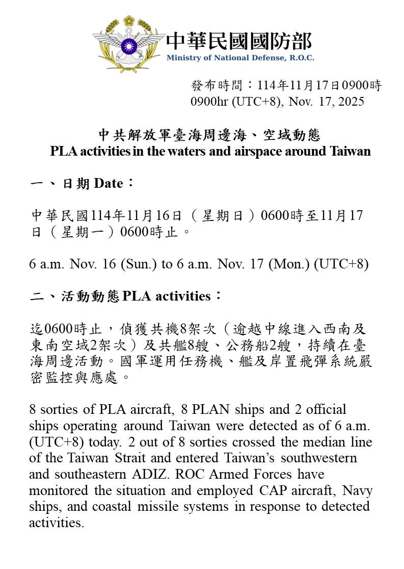 8 sorties of PLA aircraft, 8 PLAN ships and 2 official ships operating around Taiwan were detected as of 6 a.m. (UTC+8) today. 2 out of 8 sorties crossed the median line of the Taiwan Strait and entered Taiwan's southwestern and southeastern ADIZ. ROC Armed Forces have monitored the situation and employed CAP aircraft, Navy ships, and coastal missile systems in response to detected activities.