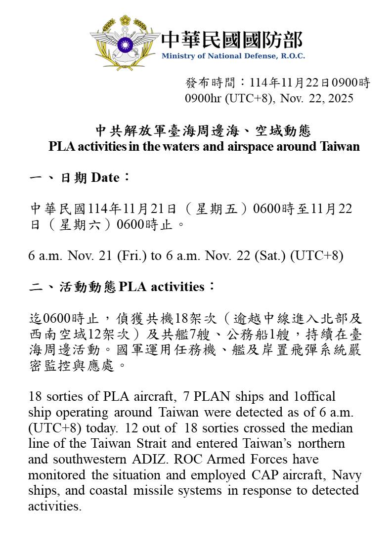 18 sorties of PLA aircraft, 7 PLAN ships and 1offical ship operating around Taiwan were detected as of 6 a.m. (UTC+8) today. 12 out of 18 sorties crossed the median line of the Taiwan Strait and entered Taiwan's northern and southwestern ADIZ. ROC Armed Forces have monitored the situation and employed CAP aircraft, Navy ships, and coastal missile systems in response to detected activities.