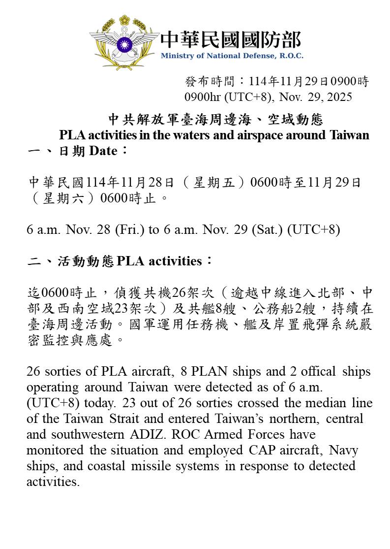 26 sorties of PLA aircraft, 8 PLAN ships and 2 offical ships operating around Taiwan were detected as of 6 a.m. (UTC+8) today. 23 out of 26 sorties crossed the median line of the Taiwan Strait and entered Taiwan's northern, central and southwestern ADIZ. ROC Armed Forces have monitored the situation and employed CAP aircraft, Navy ships, and coastal missile systems in response to detected activities.