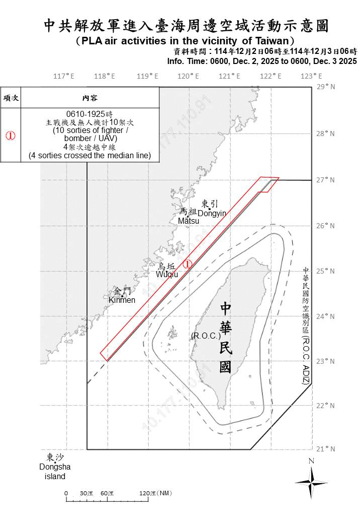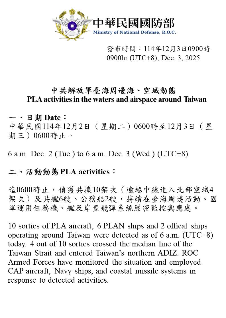 10 sorties of PLA aircraft, 6 PLAN ships and 2 offical ships operating around Taiwan were detected as of 6 a.m. (UTC+8) today. 4 out of 10 sorties crossed the median line of the Taiwan Strait and entered Taiwan's northern ADIZ. ROC Armed Forces have monitored the situation and employed CAP aircraft, Navy ships, and coastal missile systems in response to detected activities.