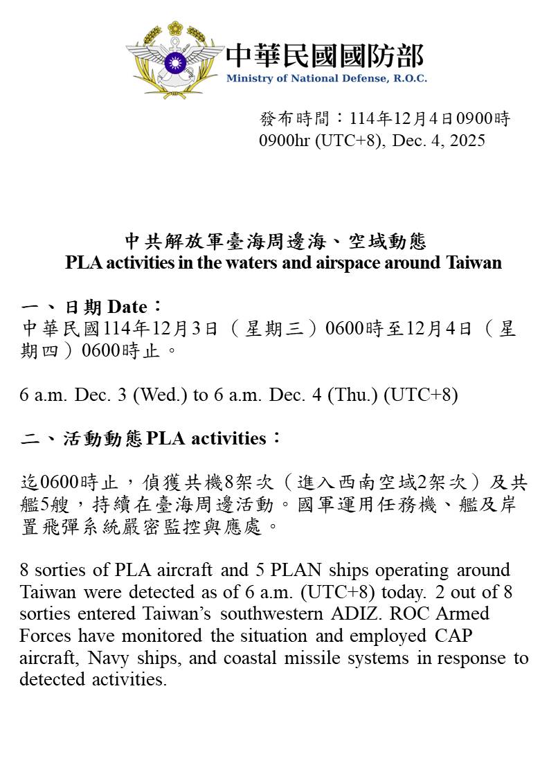 8 sorties of PLA aircraft and 5 PLAN ships operating around Taiwan were detected as of 6 a.m. (UTC+8) today. 2 out of 8 sorties entered Taiwan's southwestern ADIZ. ROC Armed Forces have monitored the situation and employed CAP aircraft, Navy ships, and coastal missile systems in response to detected activities.