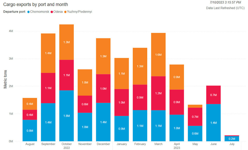 Monthly exports peaked at 4.2 million metric tonnes in October 2022, but were only 1.3 million metric tonnes in May 2023.