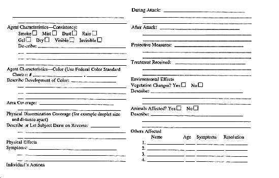This report allows a collector to note the most relevant details of testimony given by personnel associated with alleged use of chemical or non-living biological agents. Do not consider the form to be all-inclusive. |